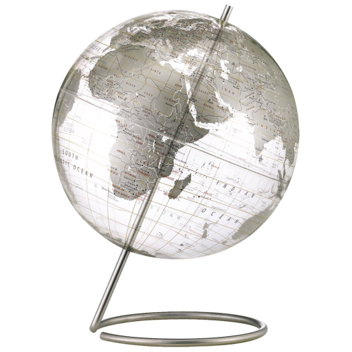 The silver-land-mass Crystal Marquise offers the enduring appeal of a globe, but with a thoroughly modern, visually stunning twist. The transparent 12″ globe ball is bisected by a unique stainless steel axis base.