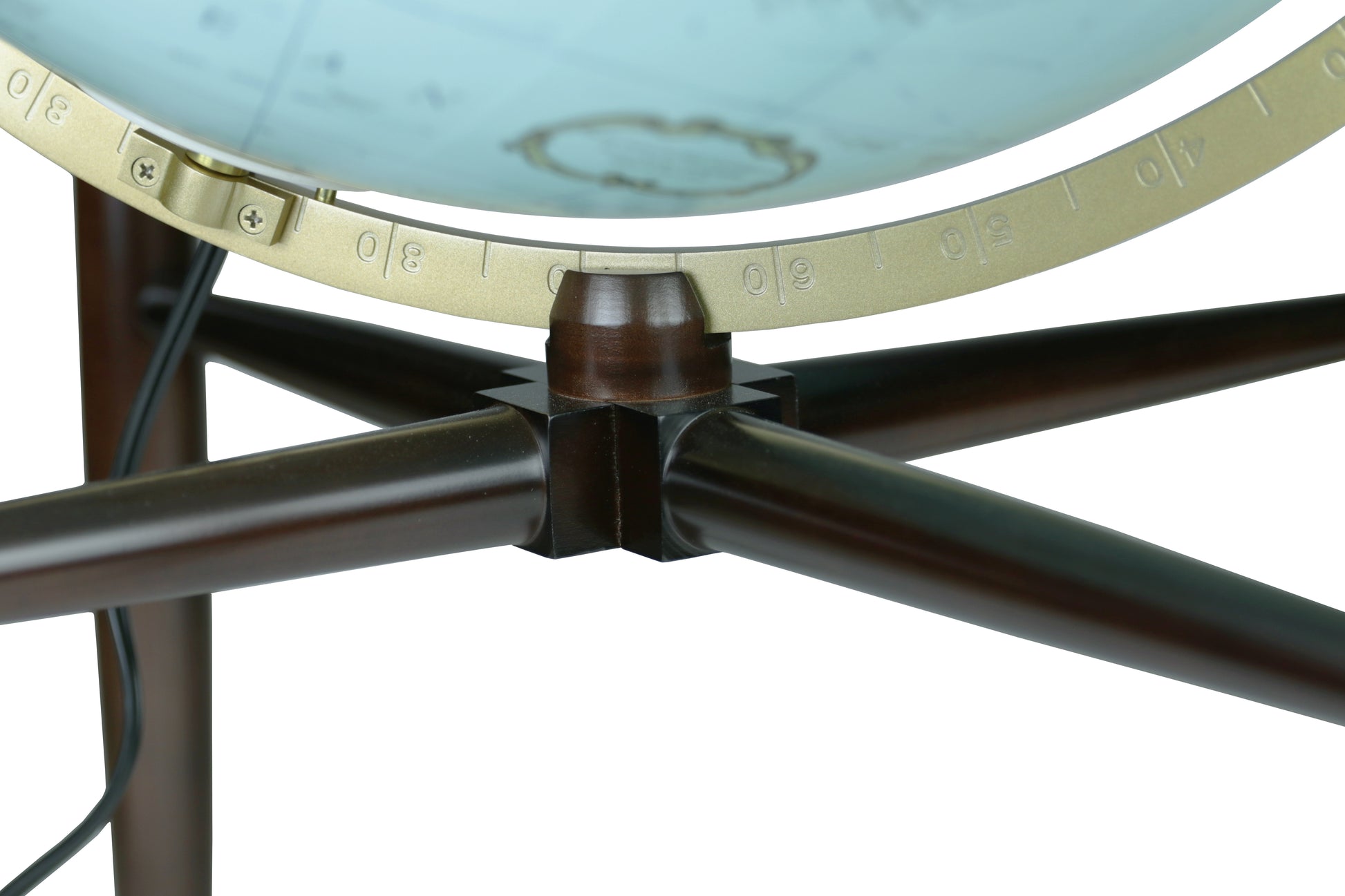 The blue-ocean Finley’s impressive 37″ height and simple lines provide an attractive backdrop for its 20″ illuminated globe ball with hand-applied, hand-cut map. Full engraved aluminum meridian in a brushed brass color, with light control.