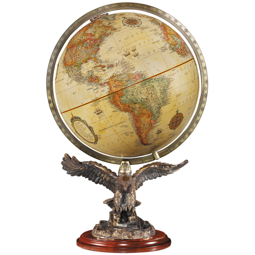 Imagination takes flight with our Freedom globe. This 12” antique-ocean globe with numbered meridian features a magnificently detailed resin eagle with bronze finish and gold accents atop a walnut-finished hardwood base. This globe is a majestic symbol and work of art for any room.
